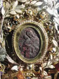 One night around 1500 (storytellers and scholars disagree on the year), some herders noticed a wild pear tree radiating light, whose source in the branches turned out to be a jasper oval, about the size of a child's hand, carved with the image of a woman and child and the Slavonic inscription, «More honorable than the cherubim, And more glorious beyond compare than the seraphim, In virginity you bore God the Word; True Mother of God, we magnify you». The portrait was recognizable as an Eleousa or Tenderness type of icon, with the child's cheek against his mother's, and the words as the refrain of the Magnificat in the Eastern liturgy.