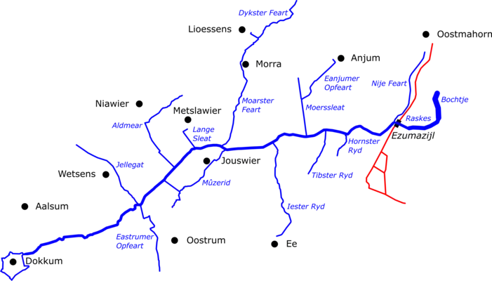 Several canals connect to the Zuider Ee, these are the: Oostrumeropvaart, Morrastervaart, Eesteropvaart, Lange Sloot, and the Anjumeropvaart (via the Moersloot).