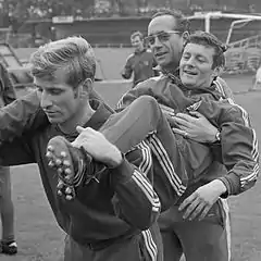 ![]() Čebinac carried by 1. FC Nürnberg teammate Fritz Popp and head coach Max Merkel during training in 1968 | |||
