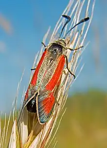 Z. punctum O. Represents the preceding African insect [ Zygaena favonia Frr.] in the South of Europe. Position of the red spots as in Zygaena sarpedon, but the apical spot enlarged, appearing washed out, being deeper red centrally and pale at the edges. Red abdominal belt always absent. Name-typical punctum occurs at the north-east coasts of the Mediterranean Sea, as far as Armenia; small, the markings of forewing more or less confluent, the hindmargin remaining broadly black. — In dystrepta Fisch.-Wald. [ now Zygaena punctum dystrepta Fischer de Waldheim, 1832], from S. E. Europe and Asia Minor, the hindmargin is only very narrowly shaded with black, the forewing being otherwise all blood-red except distal margin; this colour replaced by miniate [red lead or vermilion] in a specimen from Asia Minor received from Messrs. Staudinger and Bang-Haas under the name of malatina — italica Stgr.-Reb. [italica Stgr.-Reb. now a synonym of punctum] is a more densely scaled and therefore brighter coloured form from South and Central Italy, the apical patch being distinctly separated from the basal area by a narrow black interspace, while in the much larger contamineoides Stgr. (= contaminei Zell, dalmatina H.-Sch.) [ now Z. punctum ssp. ledereri Rambur, 1858 ], from Spain, Italy, and Sicily, a broad interspace isolates the apical spot completely. — Larva greenish, with white dorsal line and subdorsal rows of black dots, below which there are larger yellow spots. Head and thoracical legs black, abdominal legs yellow; in May and June on Eryngium. The imago in July at very limited localities, but rather common, flying low.[2] The wingspan is 25–30 mm.
