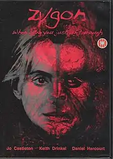 Zygon is an officially licensed Doctor Who spin-off made by an independent company called BBV.[1] It is more an adult than a family film and features some nude and sex scenes.[2] In the UK the film is rated as "18".[3] Zygon: When Being You Just Isn't Enough is directed by Bill Baggs.[4] The film is starring Jo Castleton as Lauren Anderson, Daniel Harcourt as Michael Kirkwood/Kritakh, and Keith Drinkel as Bob Calhoun/Torlakhl.[5] Jo Castleton character Lauren Anderson had previously appeared in another BBV film called Cyberon.[6] The earlier drafts of the film were written by Lance Parkin and Jonathan Blum. Bill Baggs rewrote the script. There were many significant changes to the action and characterisation and how they were presented on-screen. Parkin and Blum did not feel that the changed script represented their story well. Thus, they had taken their name off the picture.[7][8] Most of the film had been shot in 2003. According to Blum Baggs had done one more day of shooting in 2007 to finish the film.[9] The film was released on DVD in 2008. The DVD also included the documentary Zygon – Behind The Changing Faces. It is a making of documentary, that includes deleted scenes and out-takes.[10]